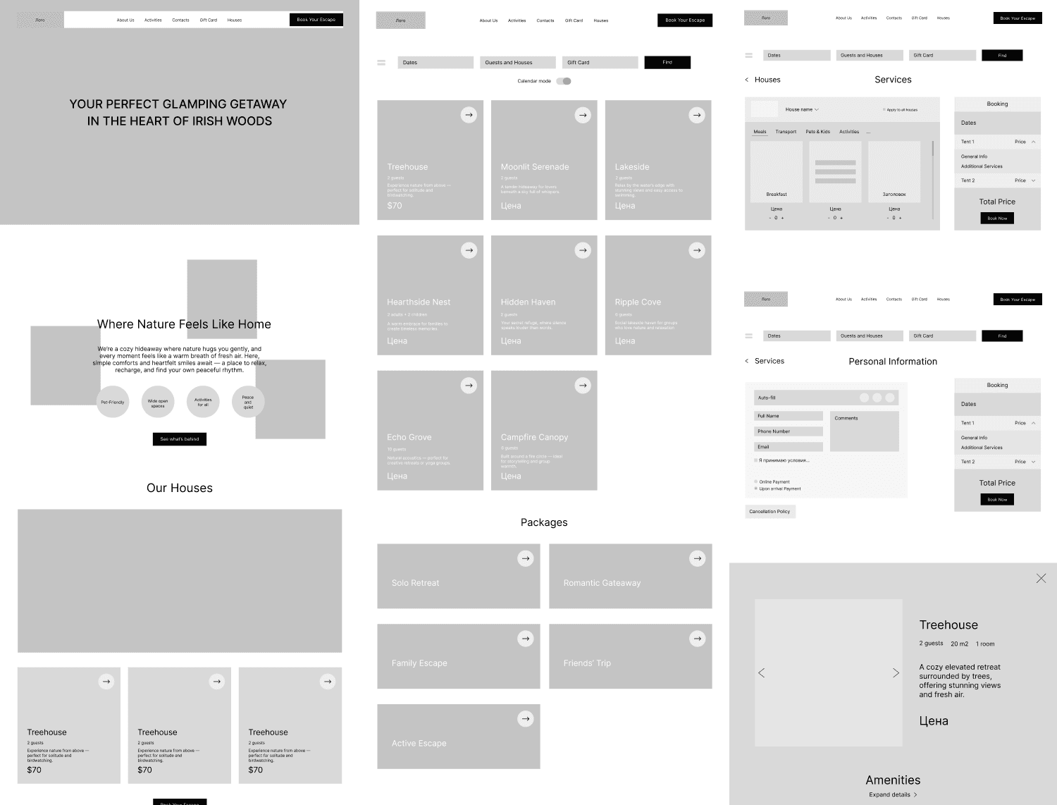Концепт сайта для глэмпинга в Ирландии с домиками для активных людей, которым нужно отвлечься от городской суеты и перезагрузиться. Проект не относится к премиум-сегменту — акцент сделан на близость к природе, душевную атмосферу, простоту и комфорт. Объём работ - UX-исследование (анализ конкурентов, карта стейкхолдеров, персонажи, user stories, JTBD) - Информационная архитектура, user flow и wireframes - Мoodboard, визуальные концепции, создание контента - UI-компоненты, дизайн-система, мобильная адаптация