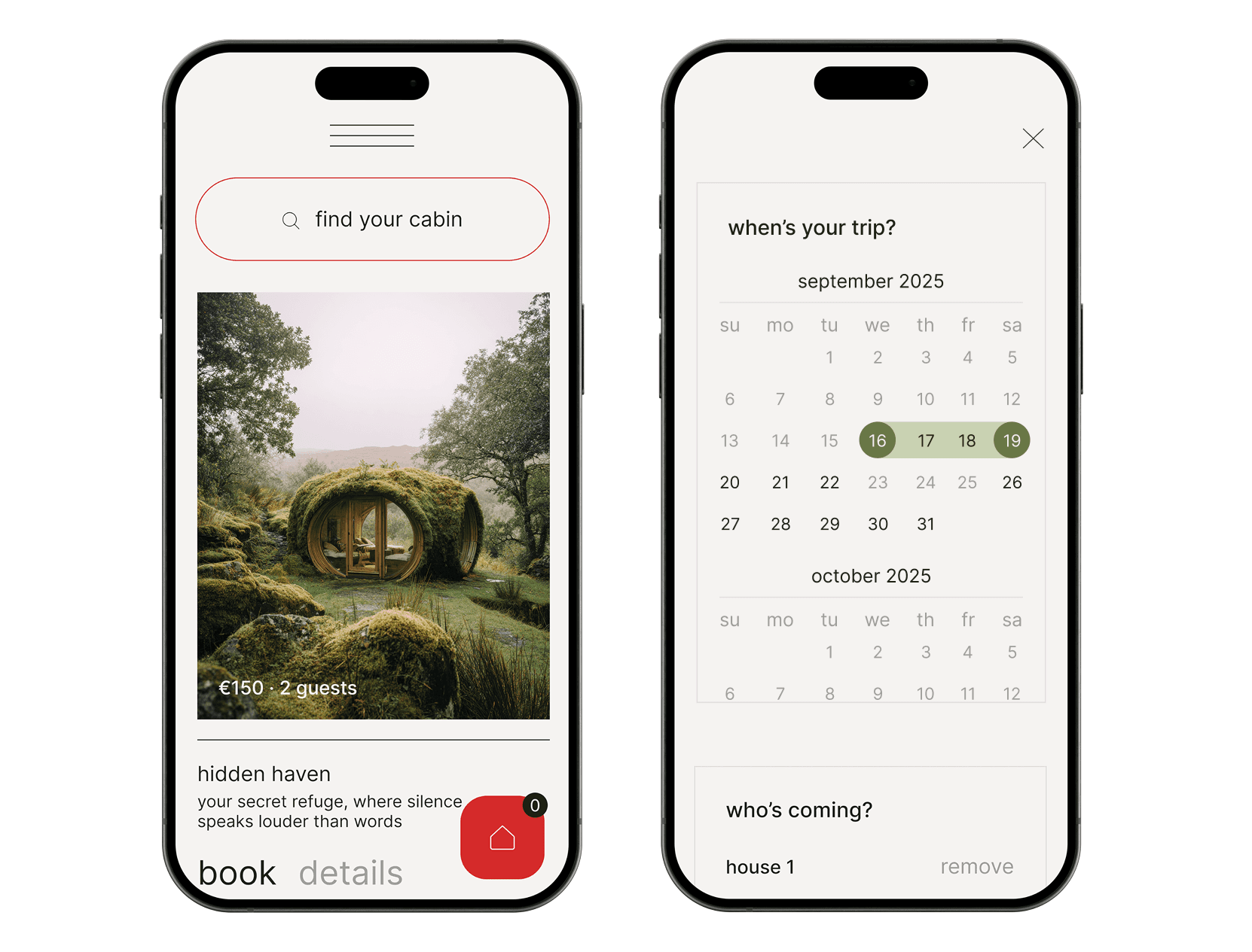 Две кнопки в карточке: «Забронировать» и «Детали». Пользователи приходят с разной готовностью к решению. Одна кнопка вынуждала всех идти через страницу домика — даже тех, кто уже выбрал. Разделение сокращает путь для решительных и не мешает осторожным.