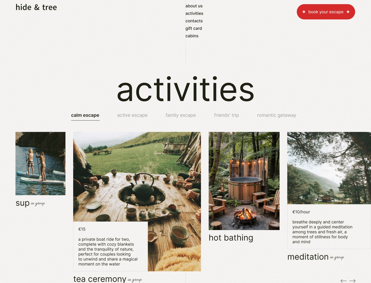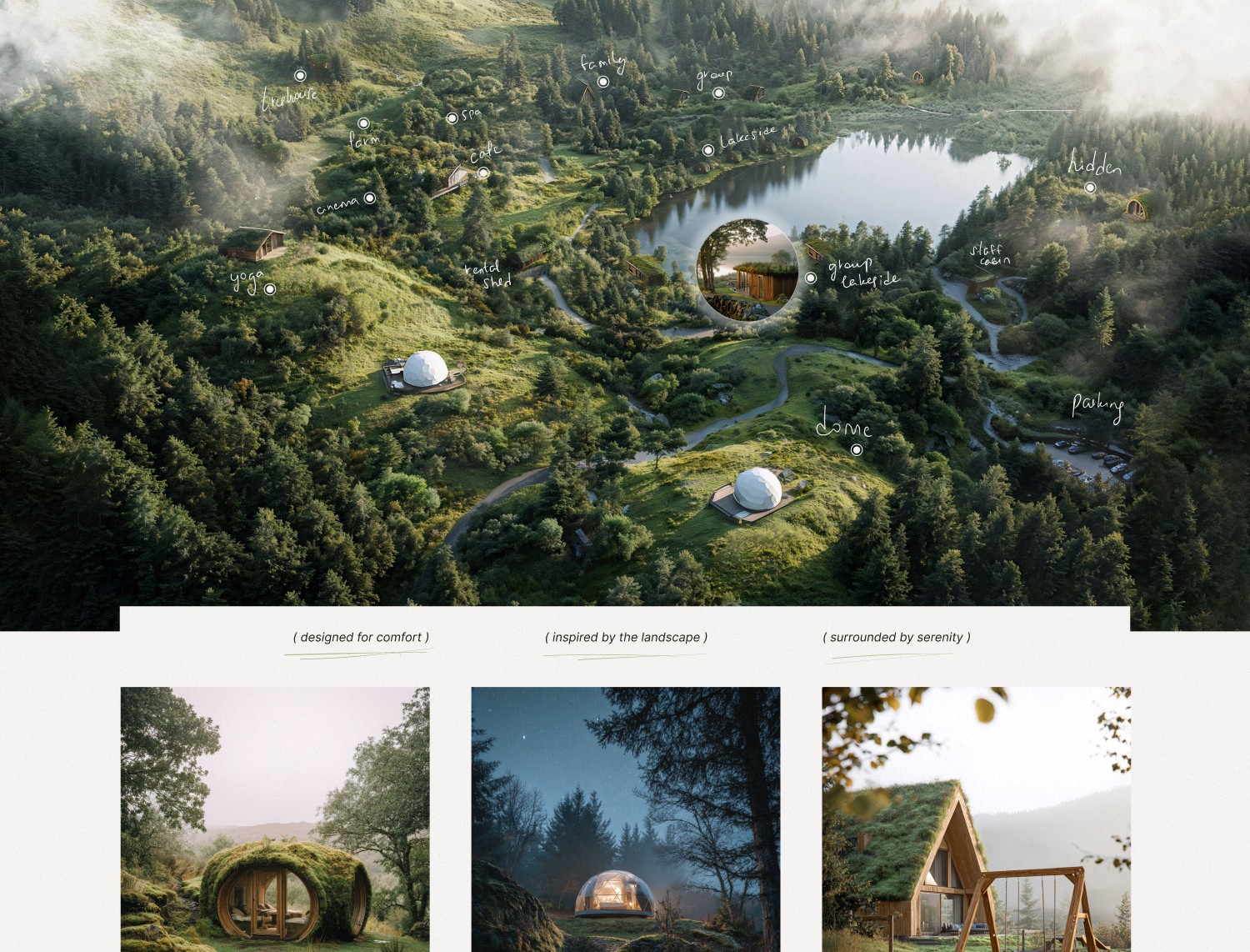 Интерактивная карта территории. Пользователь видит, где находится каждый домик, кафе, спа и зоны активностей. По клику — краткая информация и переход к деталям. Это закрывает главный вопрос: «А что там вообще есть и насколько далеко?»