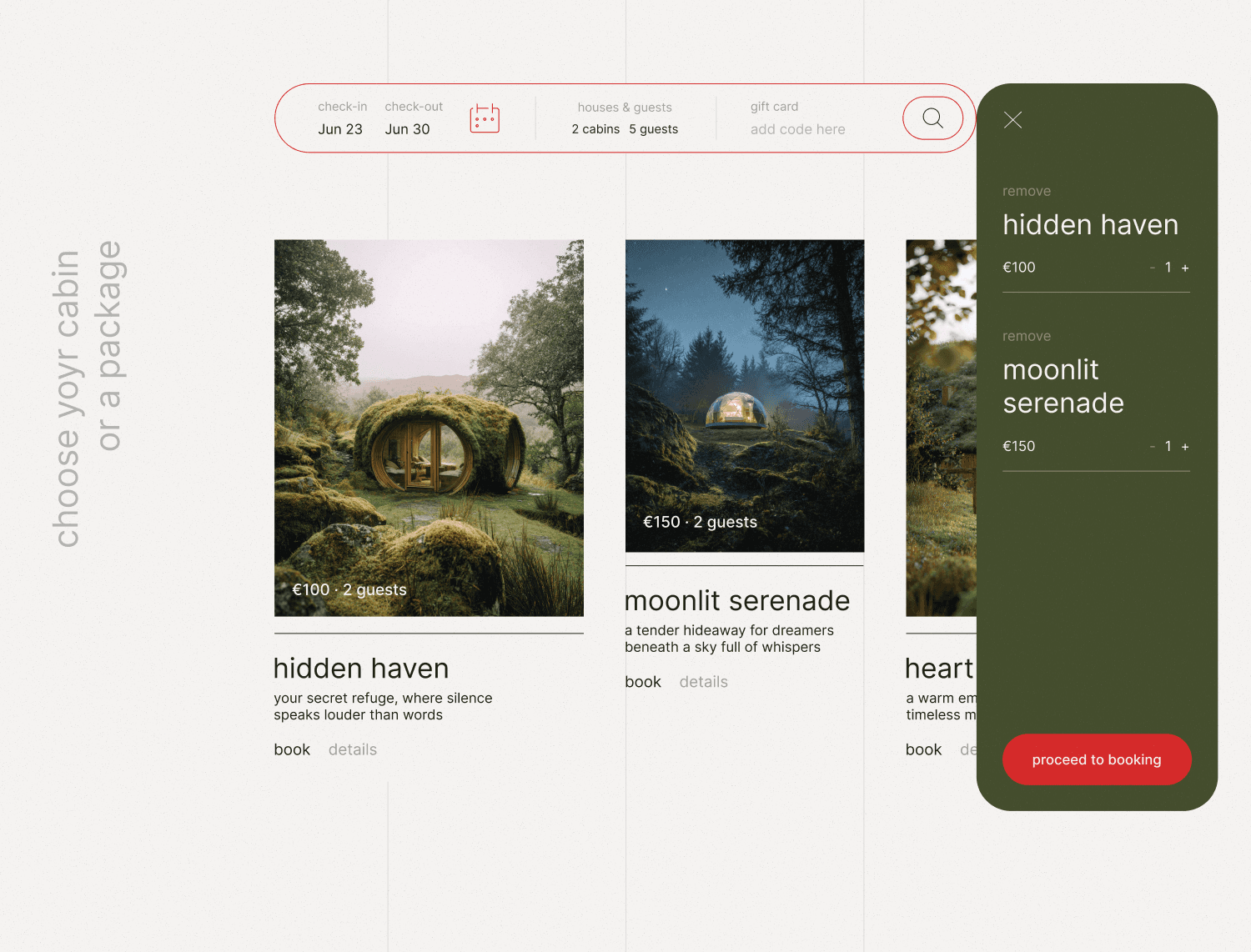 Карточки домиков без обязательного выбора дат. Пользователь сразу видит все варианты с ценами, кратким описанием. Горизонтальный скроллинг позволяет быстро сканировать варианты. Можно выбрать сразу несколько домиков и перейти к оформлению.