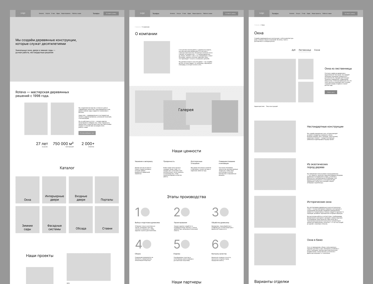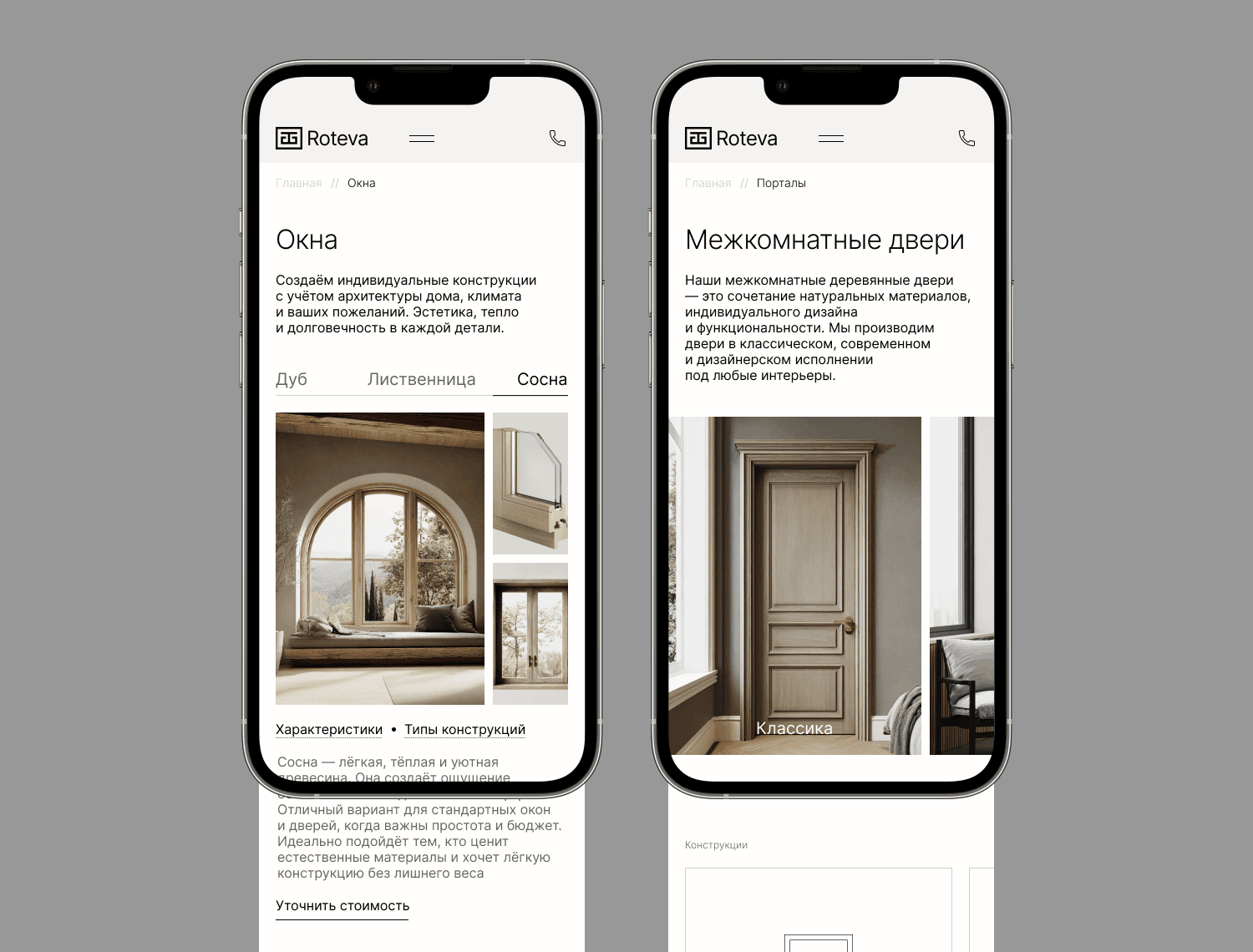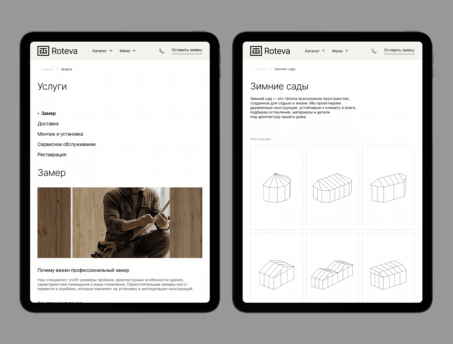 Roteva — премиальная компания по деревообработке, специализирующаяся на изготовлении окон, дверей, раздвижных порталов, фасадов и зимних садов на заказ. Объём работ - Исследование бизнеса и конкурентной среды - Метод персонажей, user stories, JTBD - Информационная архитектура, создание wireframes - Moodboard, визуальные концепции, создание контента - UI-компоненты и дизайн-система - Адаптивный дизайн для компьютера, планшета и телефона
